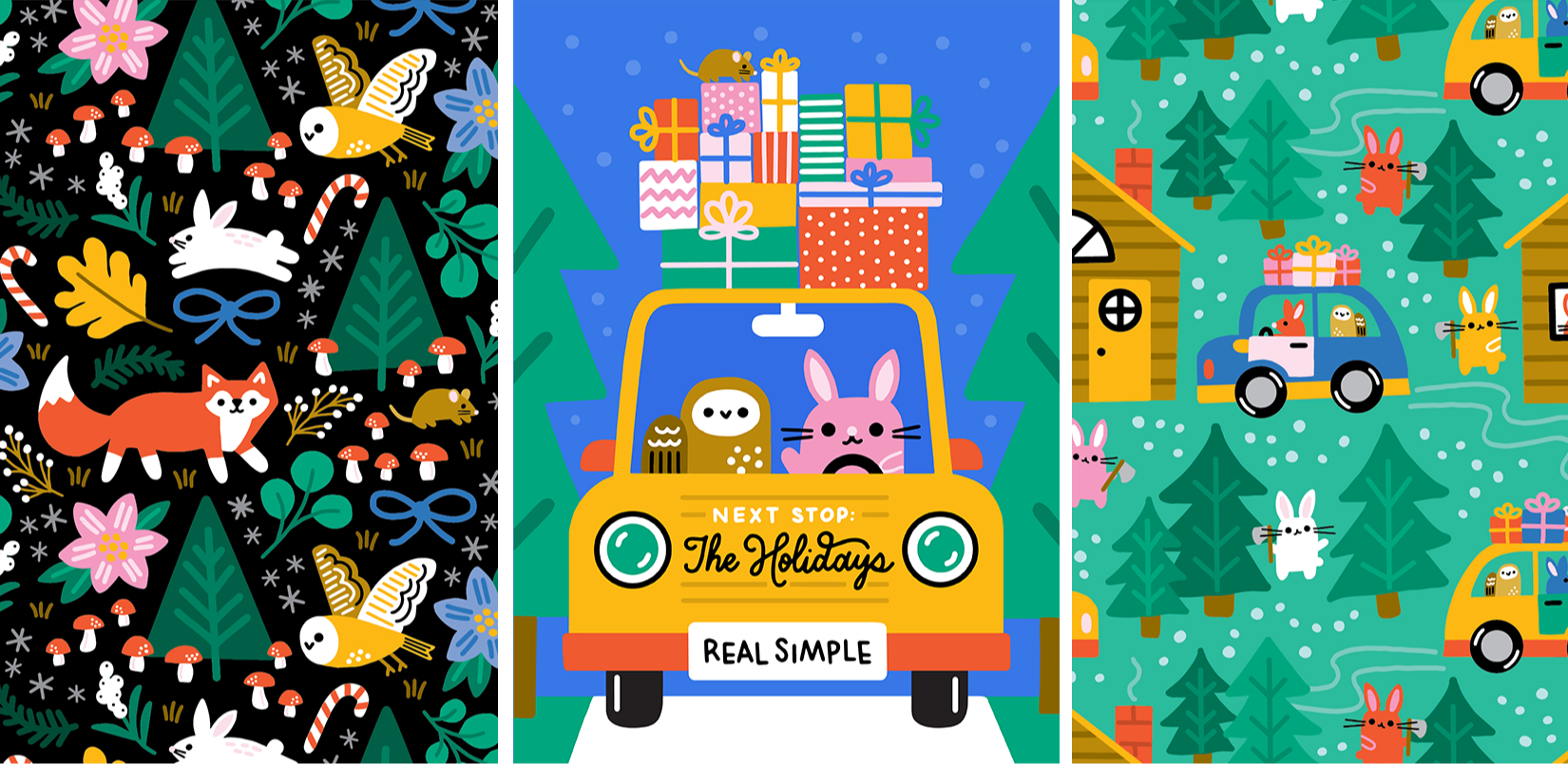 I have had the pleasure of seeing my work on a variety of products out in the world, including diapers, fabric, tea towels, children's clothes, pajamas, and greeting cards.