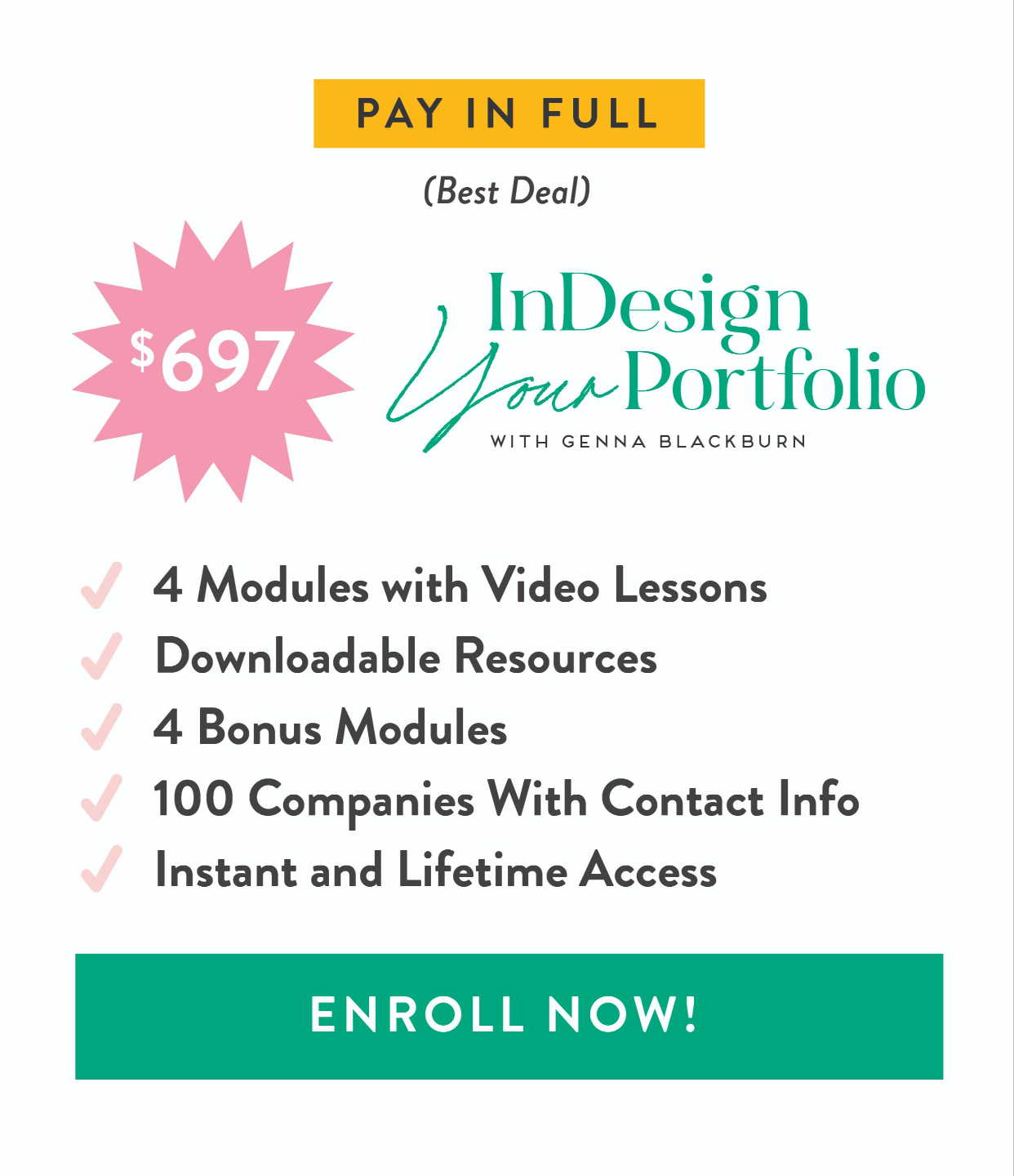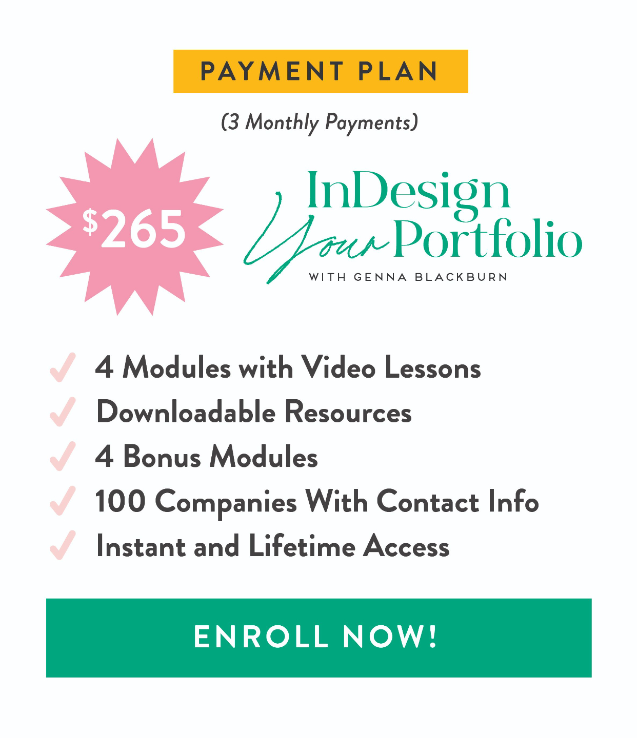 InDesign Your Portfolio is made up of 4 modules of video trainings, 5 bonus modules, and a list of 100 companies to pitch to with contact info.